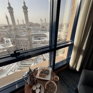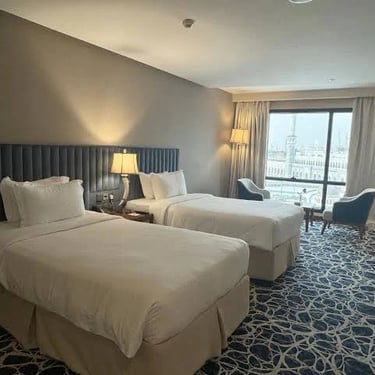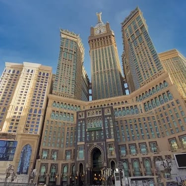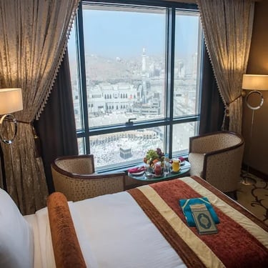 Installez-vous dans un hôtel 5★ parfaitement situé dans les tours (Al Abraj) à Makkah, à seulement 2 minutes à pied du Masjid Al Haram 🕋 — un emplacement parfait pour accomplir votre Omra en toute quiétude.